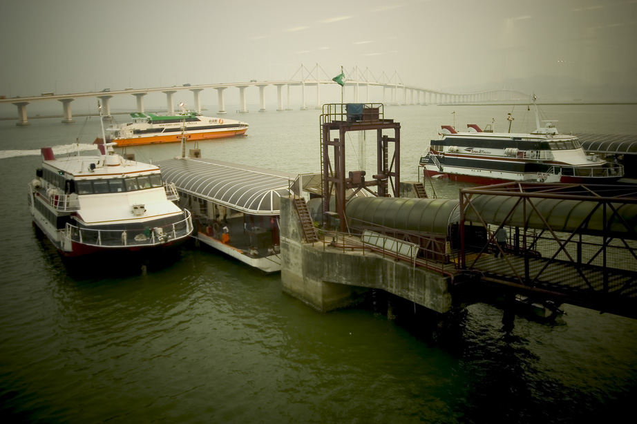 Embarquement pour le ferry vers Hong Kong. Ici, Macao et un des 2 ponts gigantesques reliant Macao à l’île de Taipa