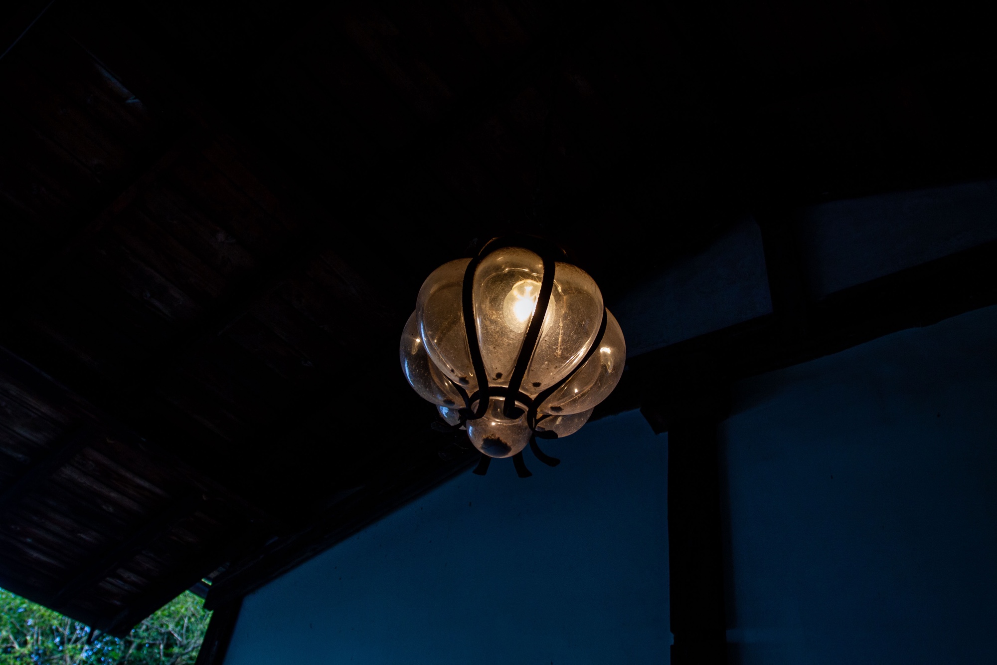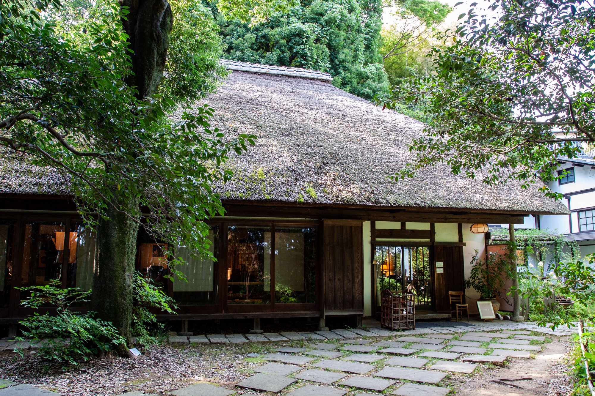 Le jardin, devant la maison au toit de chaume, est en partie couvert de bambous, plantés autour d’une petite place pavée. Il est sobre et laissé dans un état presque sauvage. Nous avons déjeuné dans une des dépendances de la maison. J’ai ramené un verre aux formes rondes, qui me rappelle un peu une des lampes de la demeure, acheté dans la petite boutique. Je l’utiliserai pour boire du café glacé pendant l’été, tout en écrivant mes billets de Made in Tokyo.