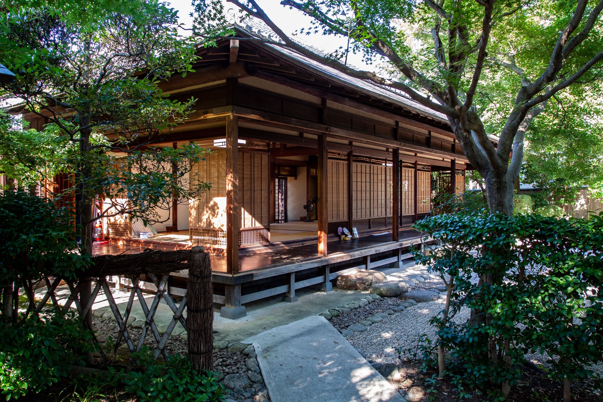 Nous visitons d’abord le Issa‑Souju Memorial Hall (一茶双樹記念館), dédié aux liens entre le poète Issa Kobayashi (小林 一茶, 1763–1828) et Sanzaemon Akimoto (également nommé). Ce dernier était producteur de mirin et poète haïku, sous le nom de plume de Sōju, tout comme Issa Kobayashi. Issa Kobayashi, originaire de la province de Shinano (actuelle préfecture de Nagano), était l’un des quatre maîtres classiques du haïku japonais à l’époque d’Edo, aux côtés de Bashō entre autres. Il est particulièrement reconnu pour ses haïkus empreints d’humilité. Il a eu une vie pleine de souffrance et montre à travers ses poèmes haïku un regard profondément humain sur la nature et la vie quotidienne. Issa fit plus de 50 visites au cours de sa vie à cet endroit dans le but de voir son ami Sanzaemon Akimoto. Le lieu a été transformé en musée en 1995 et comporte une résidence traditionnelle, un jardin japonais et une stèle gravée d’un haïku composé par Issa. Elle commémore un de ses séjours à Nagareyama entre le 27 août et le 2 septembre 1804. Il y est inscrit ceci: 夕月や 流残りのきりぎりす (La lune du soir… / et encore un cri de sauterelle / sur les eaux qui s’en vont…). Cet endroit paisible car il n’y a personne à part nous me laisse contemplatif en cette fin d’après-midi. J’aurais envie de m’asseoir et de m’allonger sur le tatami de la résidence ouverte sur le jardin.