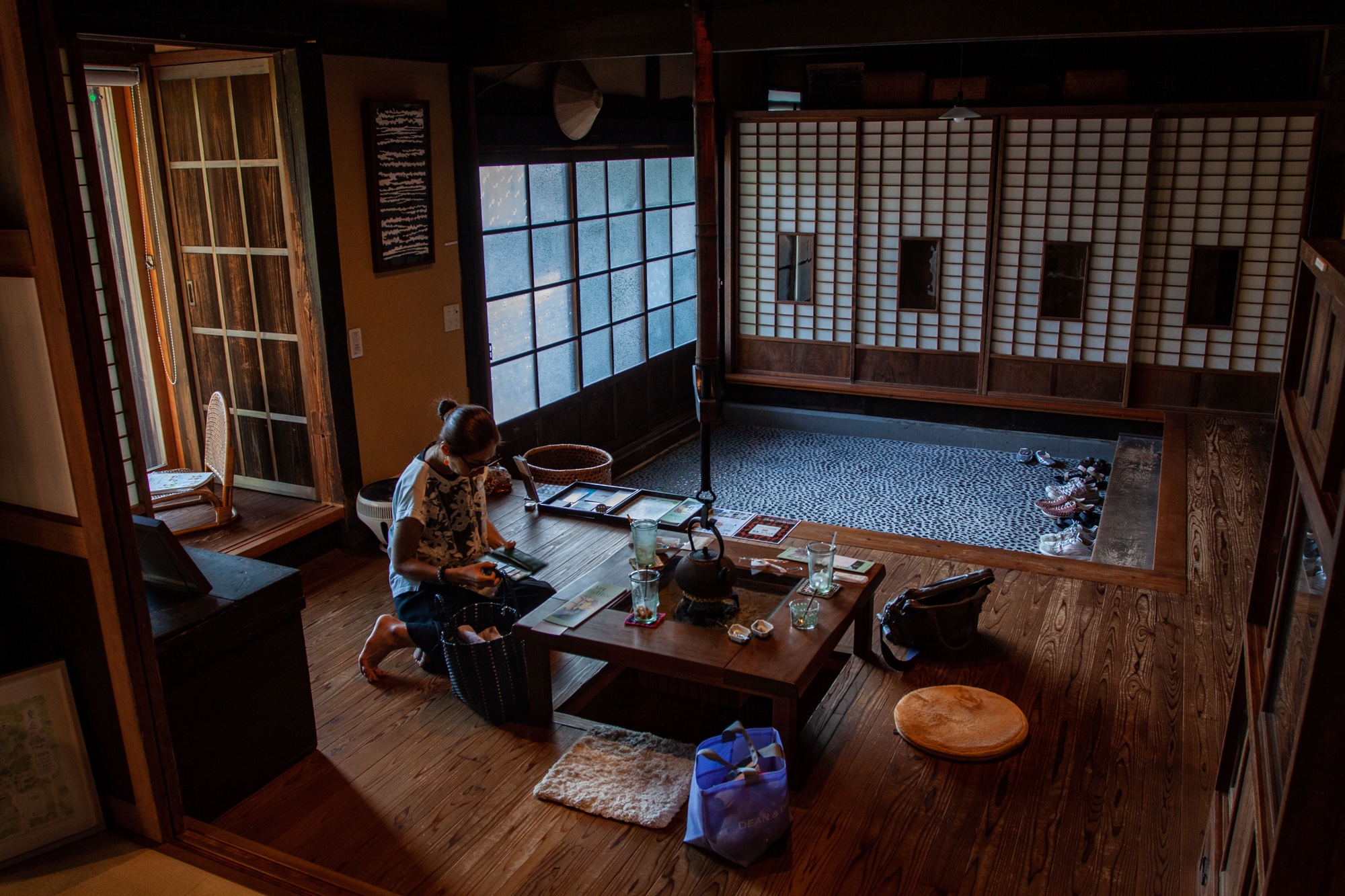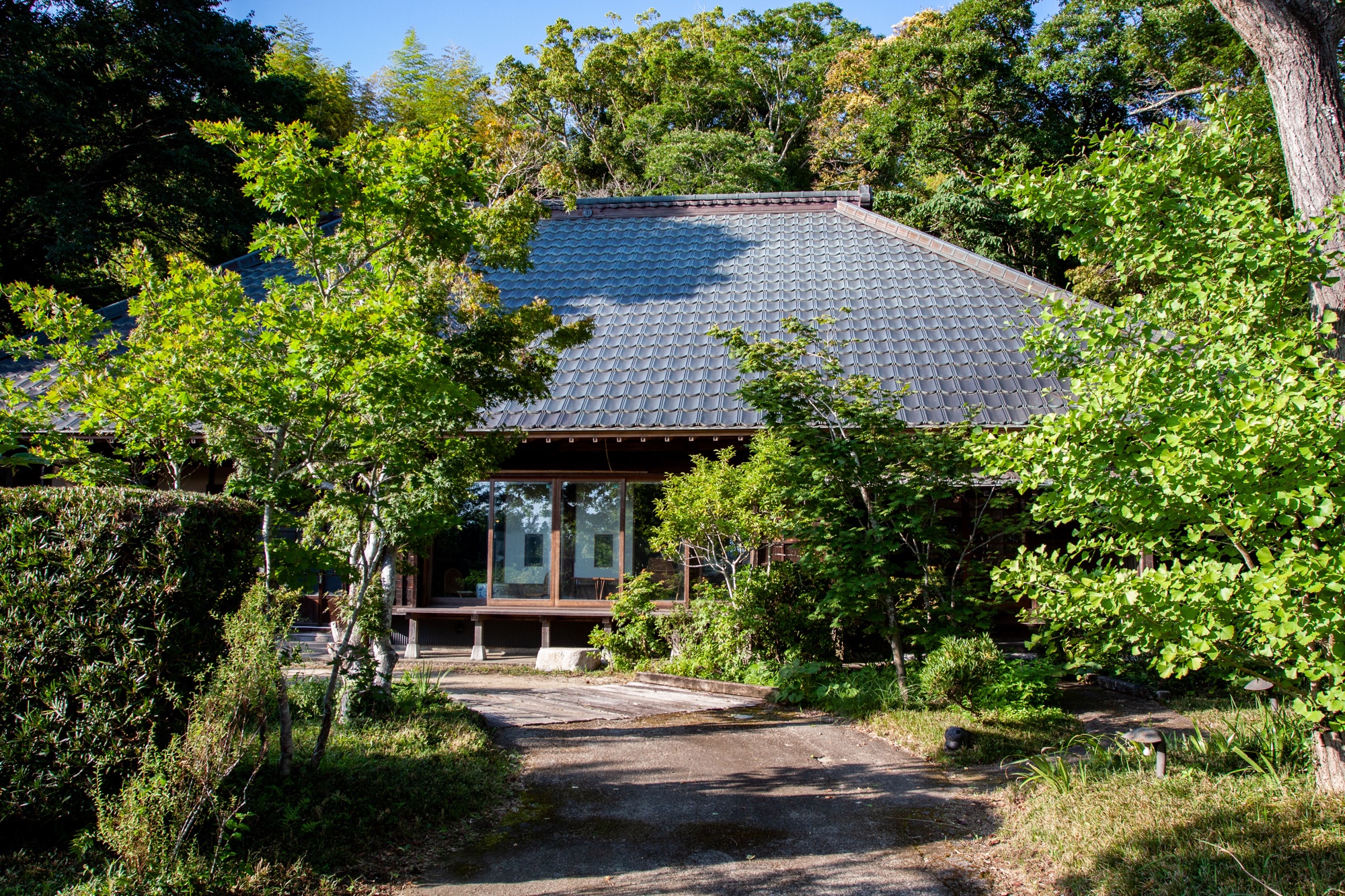 On se dirige ensuite en direction de Nagara en se rapprochant des côtes sans atteindre l’océan. On y trouve des rizières bordées de forêts et c’est dans ce paysage que nous découvrons un peu par hasard la petite galerie Natsuniwa (夏庭), située dans une ancienne maison japonaise de 160 ans de type Kominka (古民家) , entourée d’un jardin de bambous et d’un petit bassin. Cet endroit était initialement la résidence d’été familiale de Mari Uchida (内田真理), la propriétaire et fondatrice de la cette galerie qu’elle a hérité de sa grand-mère. Elle est elle-même artiste, spécialisée dans la lithographie sans eau imprimée sur du papier japonais traditionnel (washi). Une partie de la maison a été rénovée pour devenir la galerie actuelle et des expositions y sont progressivement organisées. L’endroit n’est ouvert que le week-end, du vendredi au dimanche.