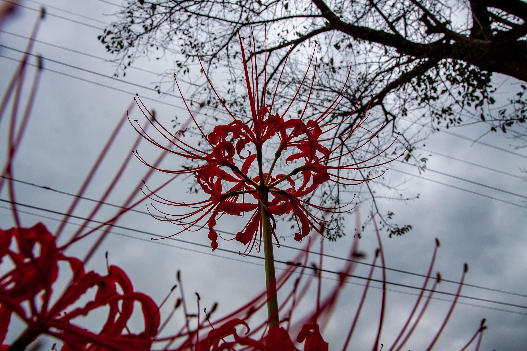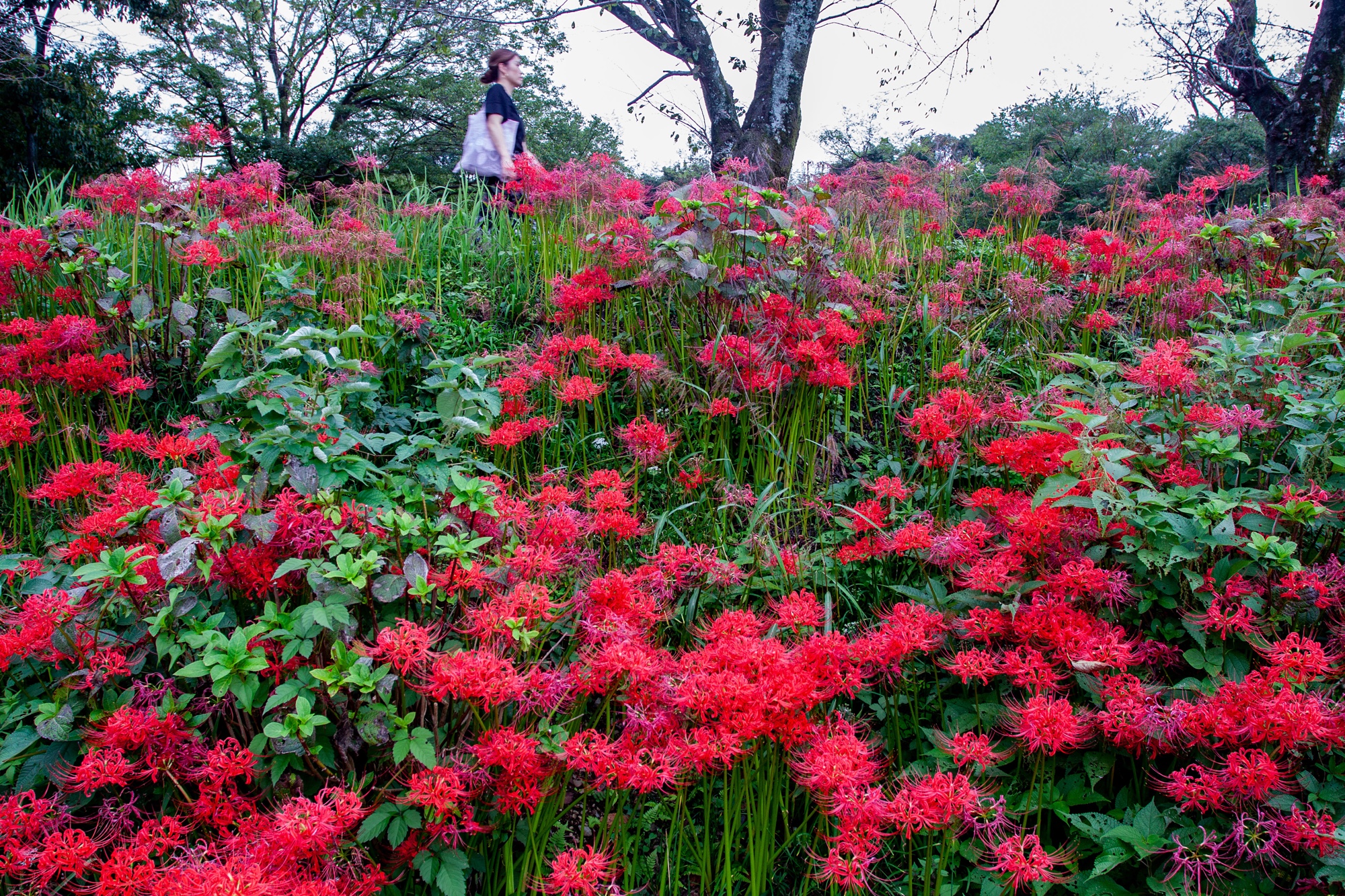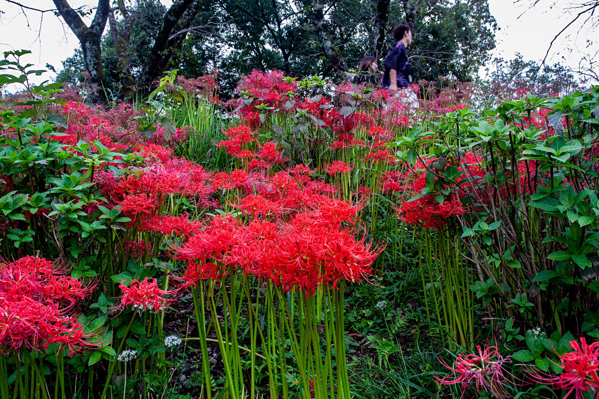Dans la culture japonaise, les Higanbana rouges sont associées au monde des morts et des esprits. En japonais, le mot higan signifie littéralement « l’autre rive », c’est-à-dire le monde des morts dans le sens bouddhique. Nous nous sommes demandé pourquoi il y avait autant de touristes étrangers dans ce parc. La réponse est peut-être liée au manga Kimetsu no Yaiba (鬼滅の刃, Demon Slayer), dans lequel cette fleur, représentée dans une couleur fictive bleue, joue un rôle symbolique et narratif. Cette Higanbana bleue (青い彼岸花) est décrite comme une plante médicinale rare, capable de prolonger la vie. La Higanbana rouge représente donc le cycle naturel qui nous conduit inévitablement vers la mort, et symbolise l’impermanence de l’être, tandis que la Higanbana bleue incarne une recherche impossible de vie éternelle, comme une transgression de la nature.