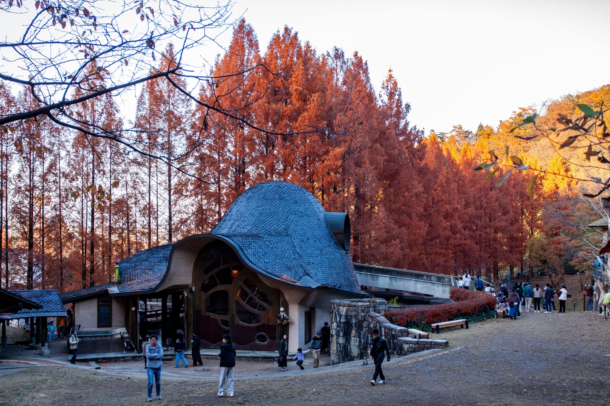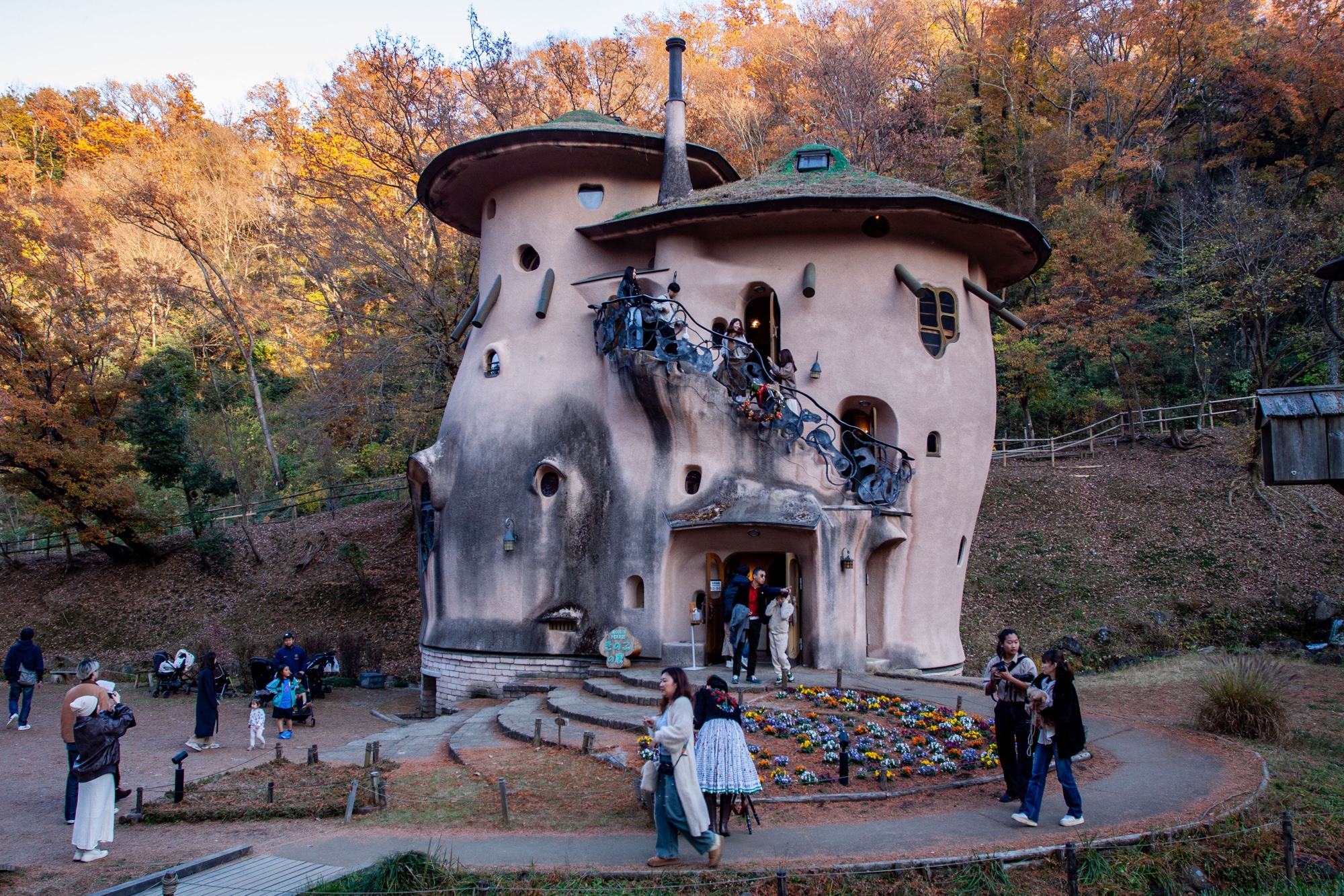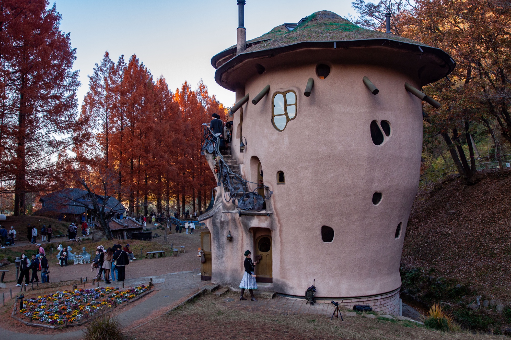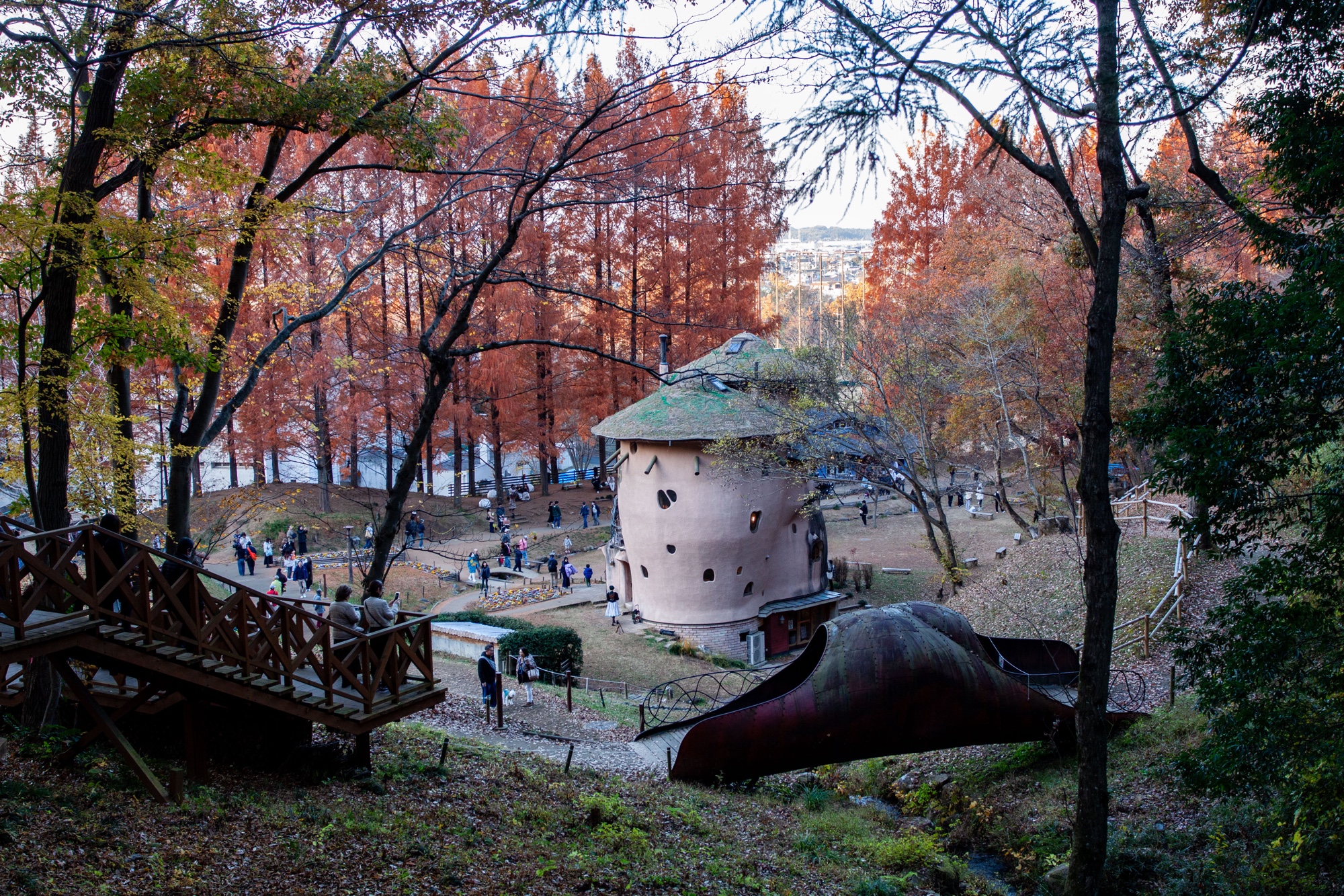 Murayama est né en 1945. Il a étudié l’architecture à l’Université de Waseda, puis après quelques années passées dans un bureau d’architecture à Tokyo, il décida de s’installer pendant plusieurs années à partir de 1977 en Allemagne et en Autriche pour s’immerger dans l’étude de la pensée de Rudolf Steiner (anthroposophie) qui a fortement influencé sa vision architecturale, sensible à l’environnement, à la nature et aux formes organiques. Il retourne au Japon en 1984 pour y fonder son propre bureau Murayama Architectural Design Office (村山建築設計事務所). On trouve dans les quelques bâtiments dispersés dans le parc Tove Jansson Akebono cette recherche d’une architecture vivante en relation directe avec la nature. Les formes architecturales sont comme des structures organiques avec des formes courbes et irrégulières. Le parc ressemble à un petit village avec chemins, étang et ruisseau et on verrait volontiers les Moomins débarquer des bois pour rentrer s’installer tranquillement dans ces étranges demeures. Cet espace naturel nous pousse à la rêverie, dans la mesure où on arrive bien sûr à faire abstraction de la foule. Il y a du monde en effet venu profiter de ce décor bordé par les feuilles rouges d’Automne des grands arbres. Un des intérêts de ce parc est qu’on peut visiter les maisons, qui ont une complexité intérieure très intéressante. L’intérieur reprend ces inspirations organiques et ressemble à un labyrinthe avec escaliers irréguliers en bois entourés de rambardes en acier à la Gaudi, volumes sculptés et toits arrondis. Les enfants y trouvent de nombreuses cachettes et l’accès à certains endroits de la demeure est même parfois difficile pour les adultes. C’est un véritable petit monde à part dans lequel on s’échappe volontiers.