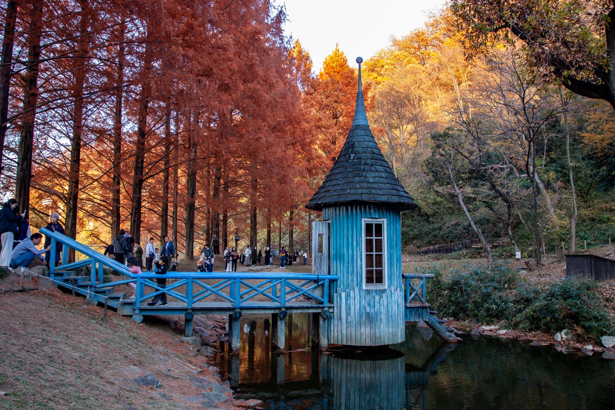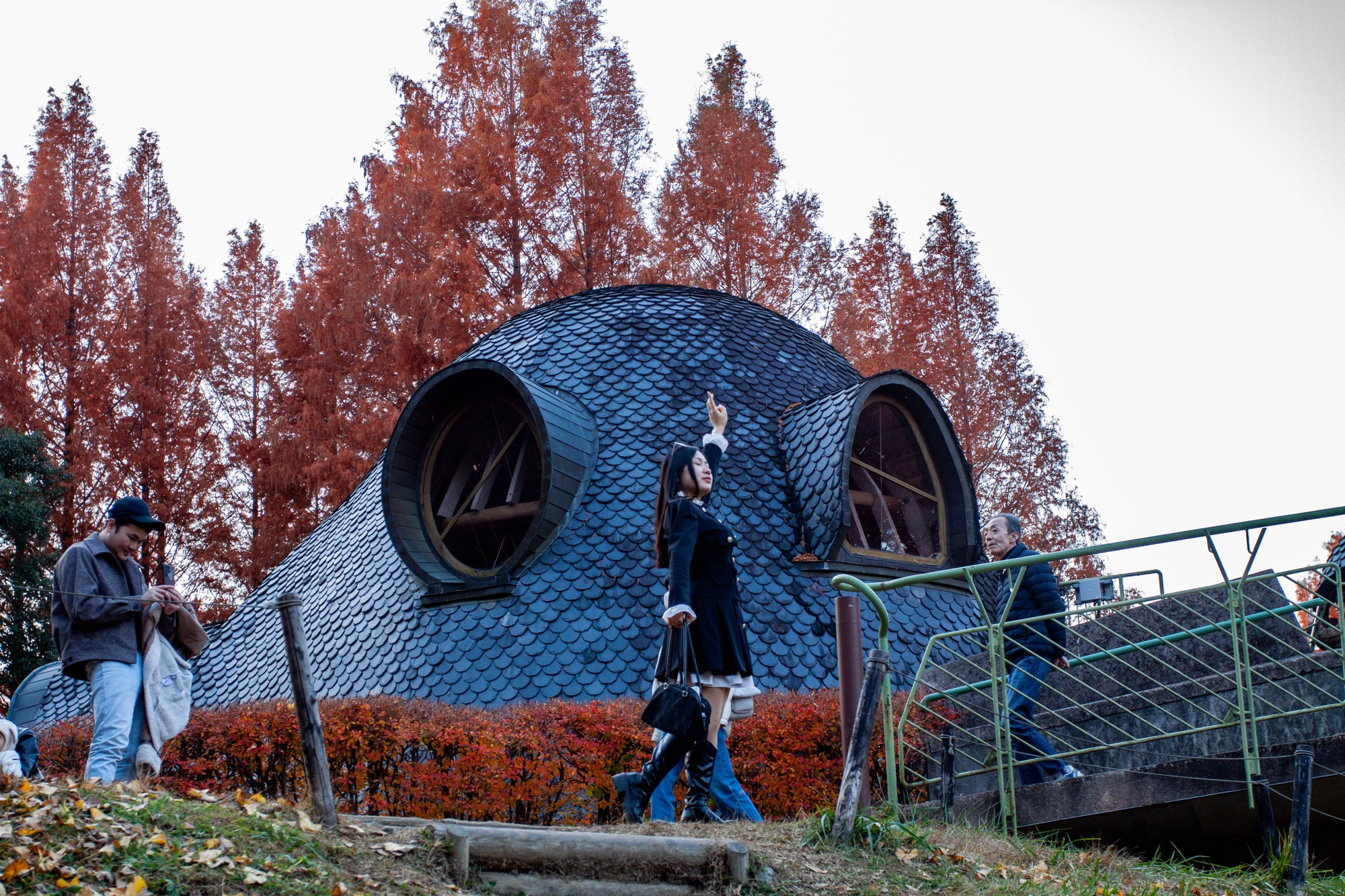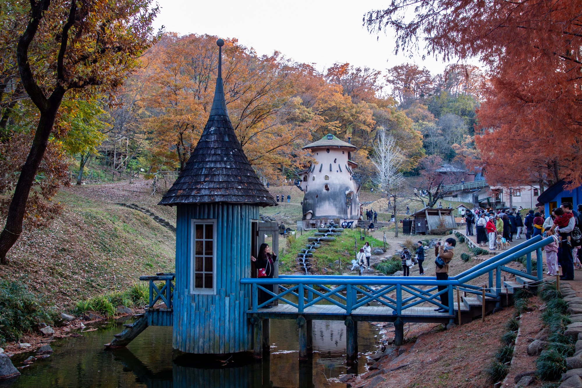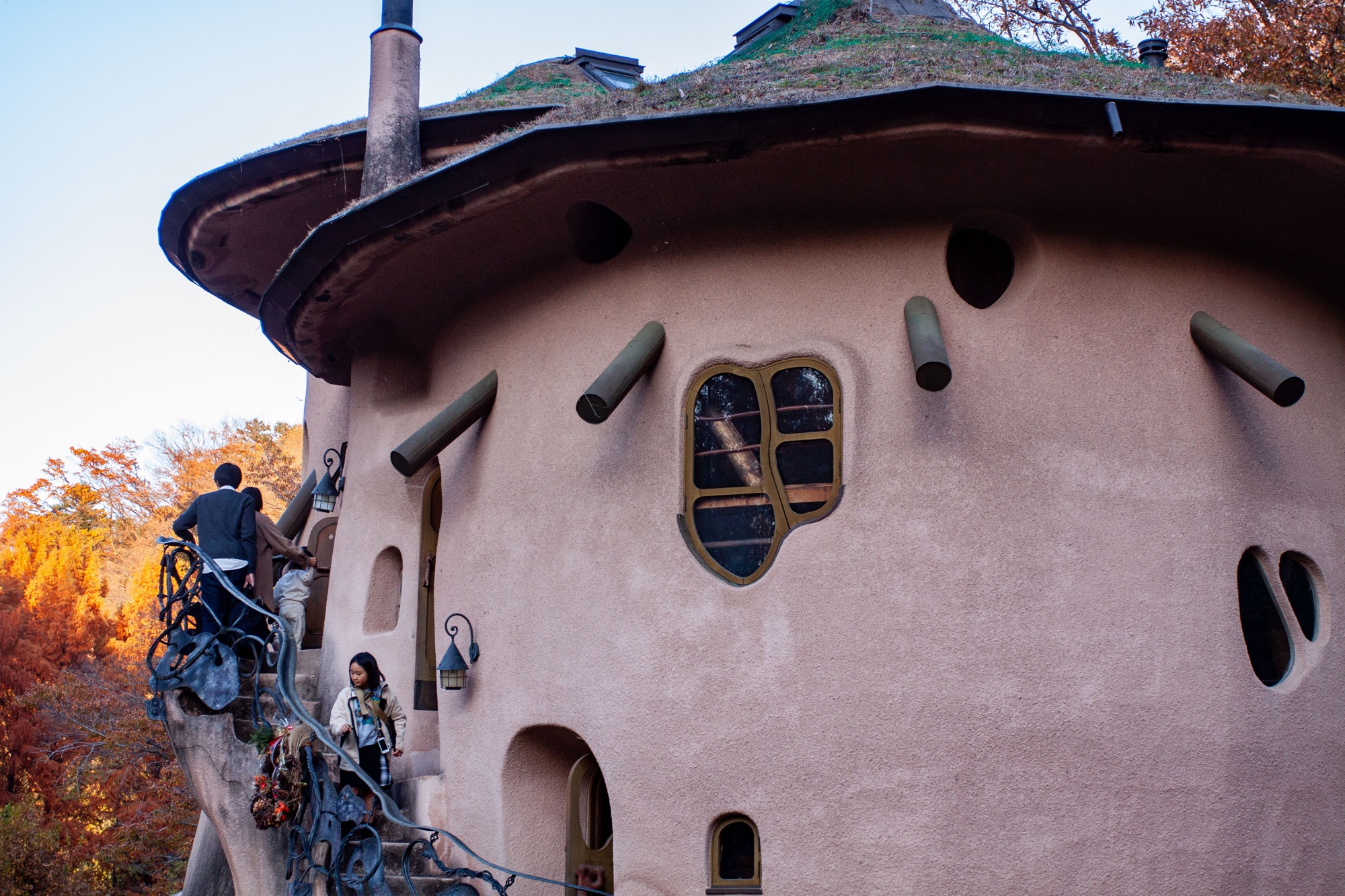 Murayama est né en 1945. Il a étudié l’architecture à l’Université de Waseda, puis après quelques années passées dans un bureau d’architecture à Tokyo, il décida de s’installer pendant plusieurs années à partir de 1977 en Allemagne et en Autriche pour s’immerger dans l’étude de la pensée de Rudolf Steiner (anthroposophie) qui a fortement influencé sa vision architecturale, sensible à l’environnement, à la nature et aux formes organiques. Il retourne au Japon en 1984 pour y fonder son propre bureau Murayama Architectural Design Office (村山建築設計事務所). On trouve dans les quelques bâtiments dispersés dans le parc Tove Jansson Akebono cette recherche d’une architecture vivante en relation directe avec la nature. Les formes architecturales sont comme des structures organiques avec des formes courbes et irrégulières. Le parc ressemble à un petit village avec chemins, étang et ruisseau et on verrait volontiers les Moomins débarquer des bois pour rentrer s’installer tranquillement dans ces étranges demeures. Cet espace naturel nous pousse à la rêverie, dans la mesure où on arrive bien sûr à faire abstraction de la foule. Il y a du monde en effet venu profiter de ce décor bordé par les feuilles rouges d’Automne des grands arbres. Un des intérêts de ce parc est qu’on peut visiter les maisons, qui ont une complexité intérieure très intéressante. L’intérieur reprend ces inspirations organiques et ressemble à un labyrinthe avec escaliers irréguliers en bois entourés de rambardes en acier à la Gaudi, volumes sculptés et toits arrondis. Les enfants y trouvent de nombreuses cachettes et l’accès à certains endroits de la demeure est même parfois difficile pour les adultes. C’est un véritable petit monde à part dans lequel on s’échappe volontiers.