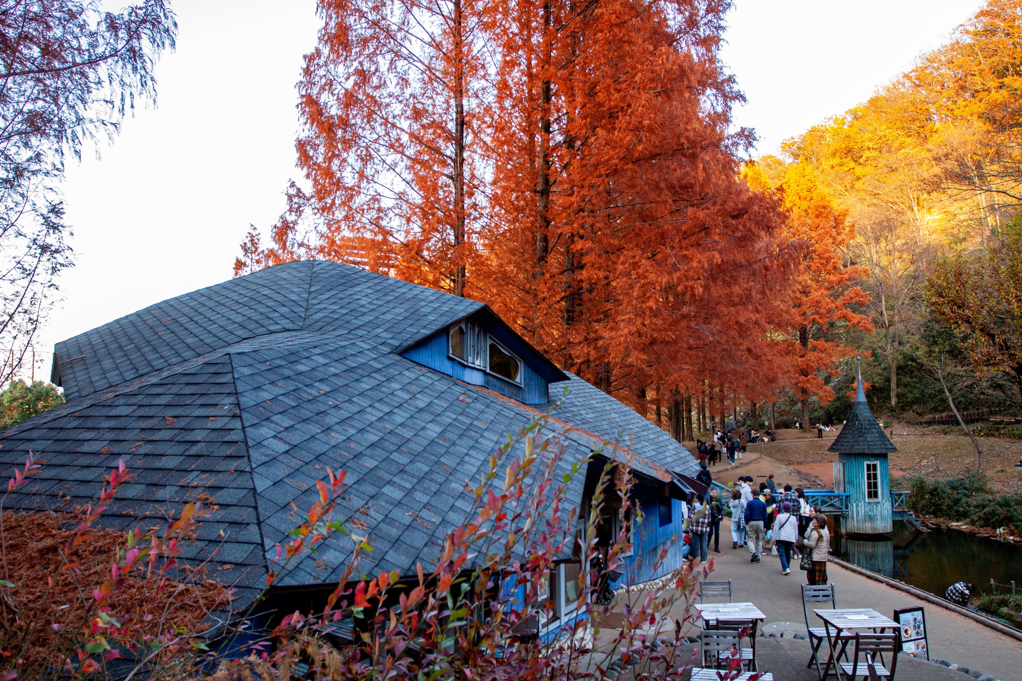 Notre parcours d’observation des feuilles d’Automne nous amène jusqu’au parc forestier pour enfants Tove Jansson Akebono (あけぼの子どもの森公園) dans la préfecture de Saitama. Ce parc inauguré en 1997 est inspiré par l’illustratrice, peintre et auteure Tove Jansson (1914–2001). Cette artiste finlandaise suédophone est surtout connue comme la créatrice des Moomins, une série littéraire et graphique mondialement populaire notamment au Japon. Je suis bien entendu familier de ces personnages mignons ressemblant à des hippopotames blancs, mais je ne connais pas du tout l’univers des livres qui sont apparemment marqués par un humour doux et une mélancolique nordique. Le parc n’a pas été dessiné par Tove Jansson, mais par un architecte japonais nommé Takekazu Murayama (村山雄一) qui a été inspiré par l’univers de l’illustratrice. Ce parc forestier est en fait l’oeuvre la plus remarquable de l’architecte, mais ces autres créations gardent cette caractéristique d’une architecture vivante et organique.