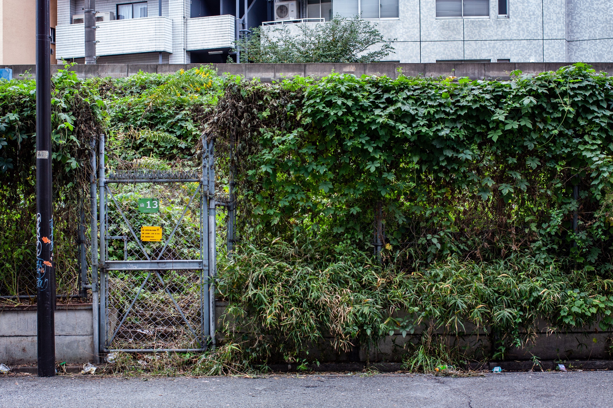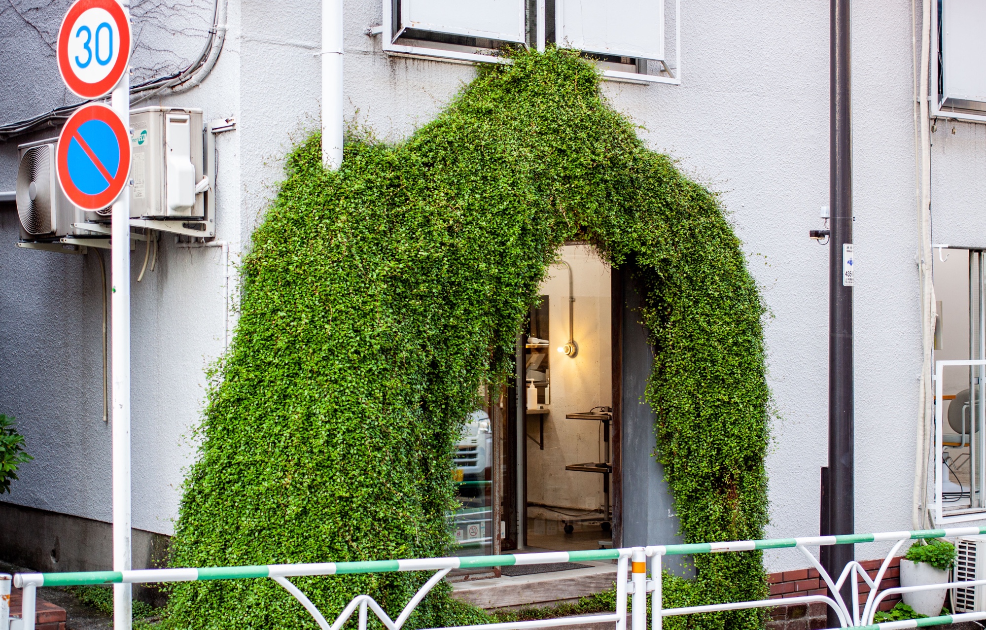 Il n’est pas rare de voir la nature reprendre ses droits dans les rues de Tokyo. Sans lui redonner complètement le contrôle des lieux, on peut ponctuellement voir des rues où on a laissé s’étendre la végétation sans tenter de l’arrêter ni lui donner des limites. Je le remarque sur certaines rues où les buissons des trottoirs s’étendent parfois jusqu’à gêner le passage. Les services de la ville finissent par couper ce qui dépasse, mais la végétation a largement le temps de pousser et de s’étendre avant que cela n’arrive. Dans une rue en pente au delà du centre d’Ebisu, je remarque une porte d’un salon de coiffure entouré de verdure. Cette végétation envahissante est plus qu’un élément décoratif, elle fait partie entière de l’architecture des lieux. Elle donne même à cette entrée quelque chose de mystérieux et merveilleux, comme une grotte dans laquelle on trouverait des trésors cachés. Je suis toujours étonné de voir la végétation dense qui entoure parfois les voies ferrées. Je le constate notamment le long de la ligne chemin de fer entre Ebisu et Shibuya. L’accès à la voie ferrée est fermé par des grillages qui sont eux mêmes recouverts de lierres. Derrière ces grillages, la végétation est dense et semble ne pas être vraiment maîtrisée. Des portes donnent un accès à ces zones autour de la voie ferrée, mais je me demande si elles sont souvent utilisées.