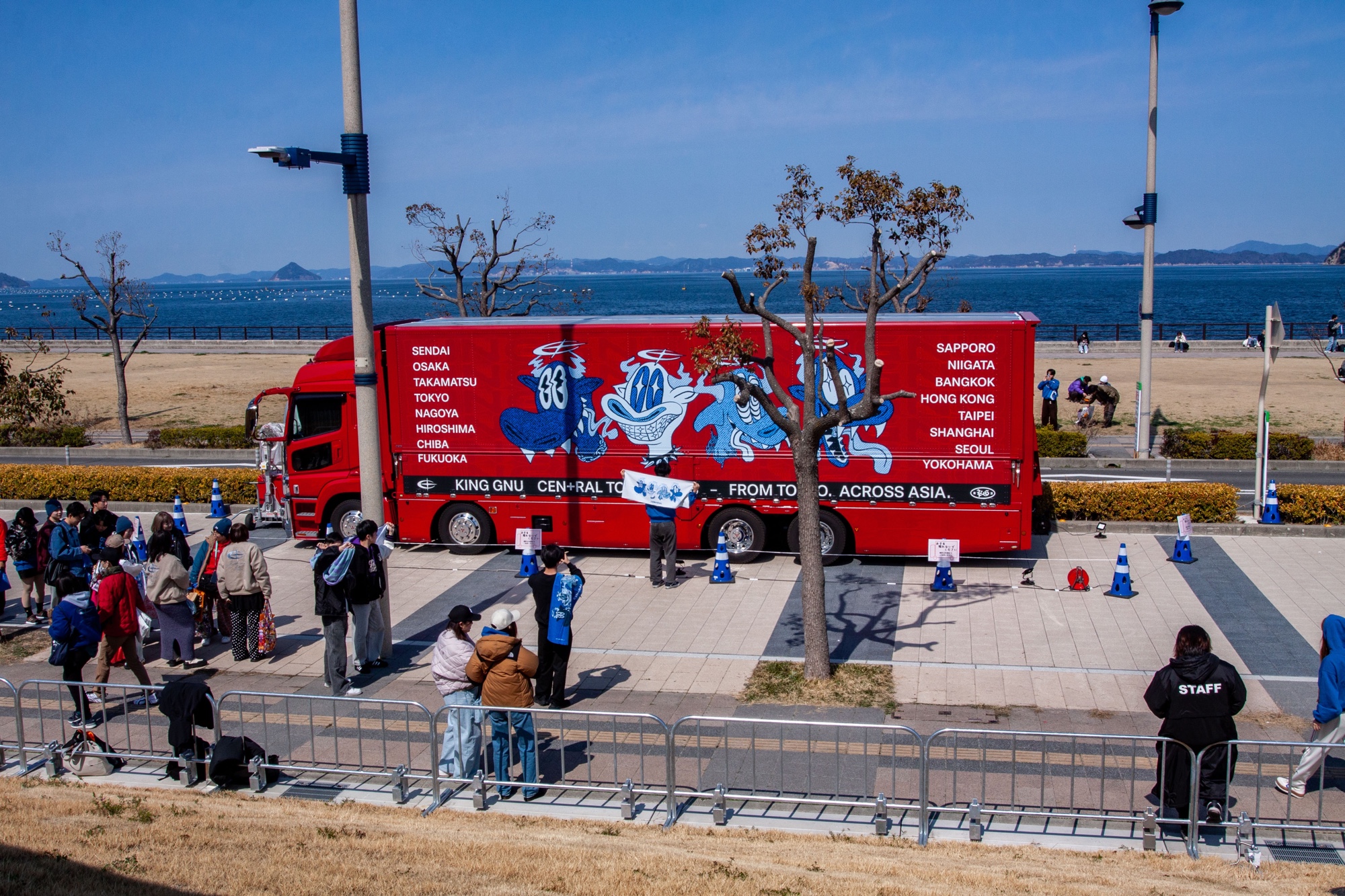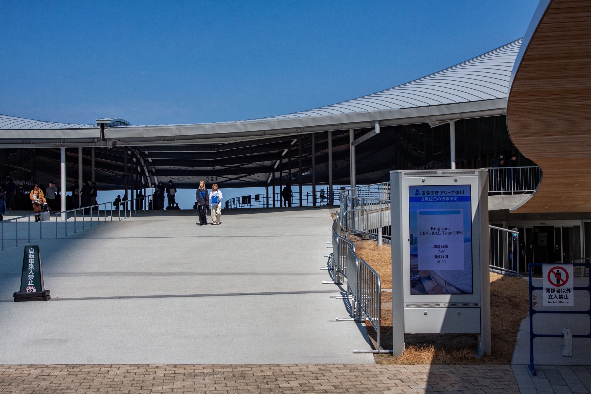 La tournée King Gnu CEN+RAL Tour 2026 se déroule en 30 dates au Japon et en Asie. Elle a démarré à Osaka le 21 Février pour deux dates, puis est passée par Sendai. Takamatsu est la troisième escale avec également deux dates, les 11 et 12 Mars. Elle partira ensuite à Tokyo, puis Nagoya, Hiroshima, Chiba, Fukuoka, Sapporo, Nigata. Le groupe entamera ensuite la partie internationale de la tournée en Asie en passant par Bangkok, puis Hong Kong, Taipei, Seoul pour un final au Japon, à la Yokohama Arena en Juillet 2026. C’est une bien longue tournée, qui n’accompagne pourtant pas de nouvel album, mais une série de singles qui sont particulièrement percutants et ont très bien marchés. J’écoute la musique de King Gnu depuis leur deuxième album Sympa, en les découvrant avec le titre Flash!!!. C’est un des seuls groupes qui parvient à nous mettre d’accord dans notre petite famille. C’est un peu dommage que nous n’ayons pu avoir que deux places. Mari m’a laissé sa place car je semblais bien malheureux de ne pas avoir obtenu de places pour le concert de Sheena Ringo cette année. Ça me rappelle que Ringo les a découvert en concert, avant même que le groupe s’appelle King Gnu (leur nom originel était Srv. Vinci). Daiki Tsuneta (常田大希) et Satoru Iguchi (井口理) étaient toujours étudiants à l’Université des beaux-arts de Tokyo. Ce n’est que bien plus tard que Daiki Tsuneta avec son autre formation Millennium Parade proposera à Ringo de chanter sur le fameux single W●RK.