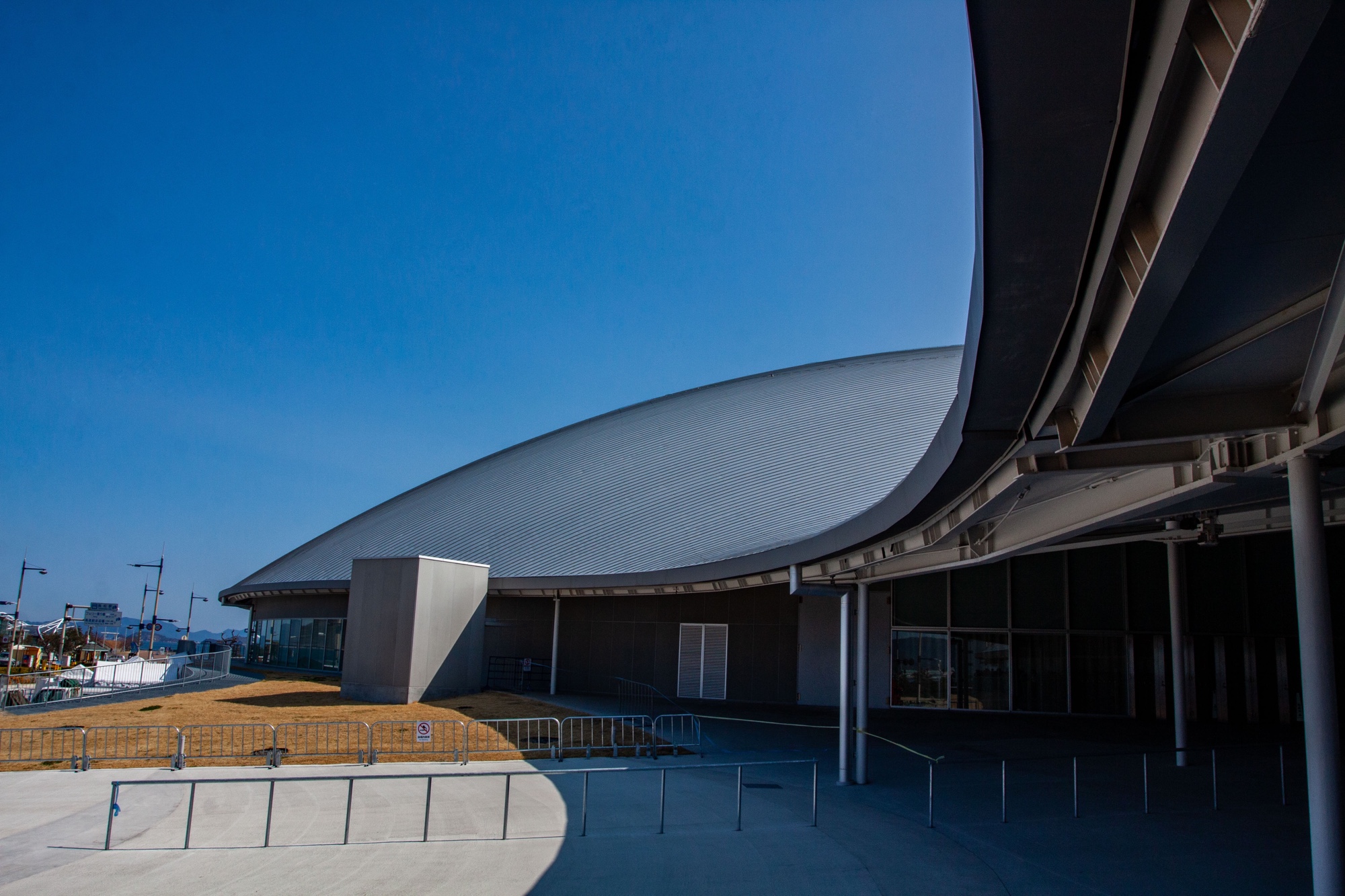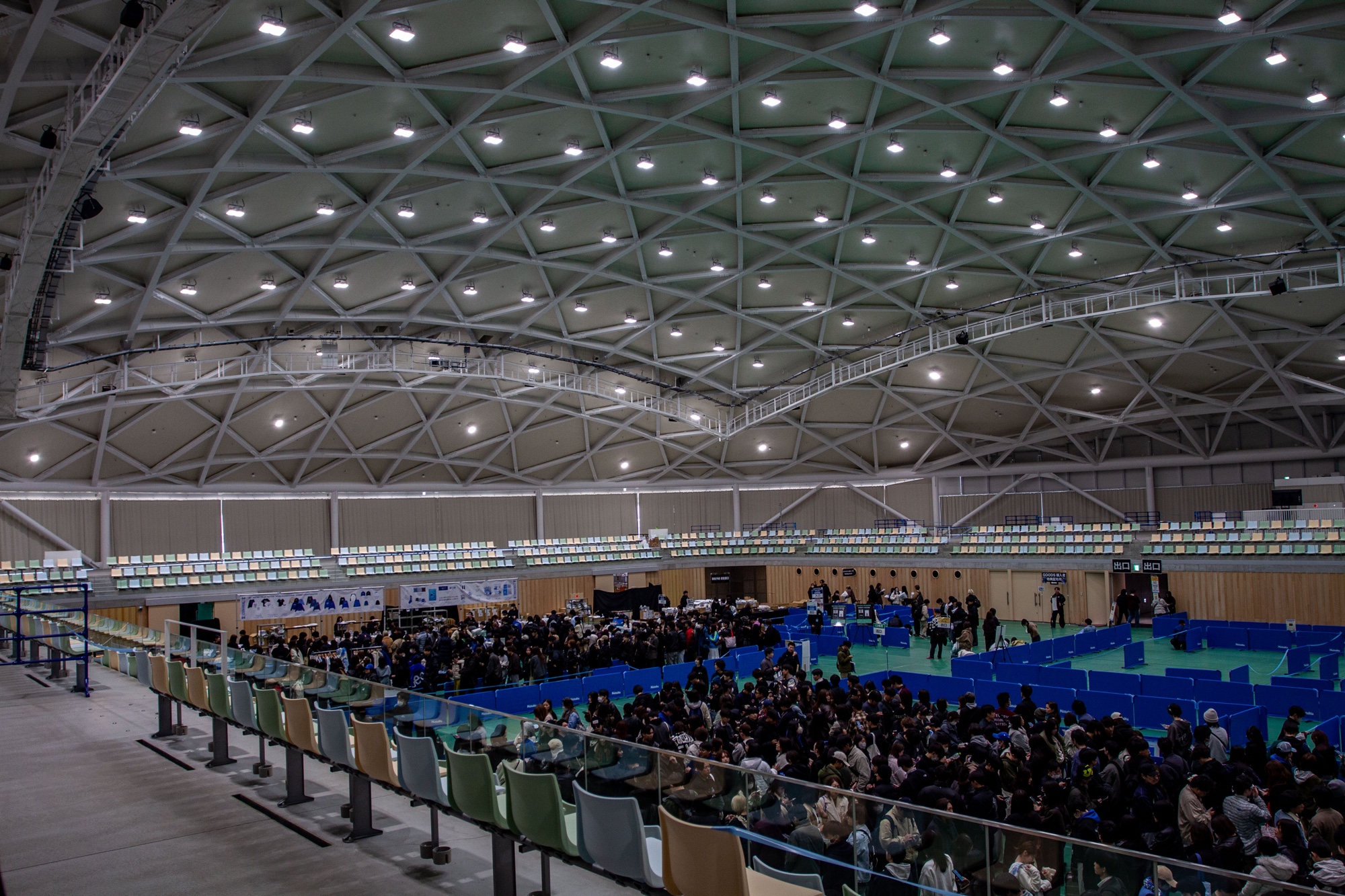 Nos places sont situées dans l’arène principale mais pas au plus près de la scène. L’organisation autour d’une scène centrale, un peu comme au Budokan de Tokyo est par contre très bien pensée car on peut garder une bonne vue, peu importe où on se situe. Derrière nous, il y a d’autres places en hauteur dans un anneau circulaire normalement utilisé pour la configuration en salle de sport. Ce sont des places assises mais tout le monde se lève dès le début du concert. On s’assoit, comme beaucoup, dans l’herbe du parc près de la mer en attendant les 17h30. Le soleil se couche doucement. Il fait frais mais pas vraiment froid, malgré un petit vent occasionnel nous piquant les joues. À 17h30, le comptage méthodique commence et prend beaucoup de temps pour éviter la cohue. Tout le monde est très discipliné, sans être forcé à l’être, et tout paraît si simple quand c’est le cas. Les haut-parleurs un peu bruyants nous rappellent bien le dispositif d’entrée. Une fois nos numéros appelés, nous entrons dans la salle déjà presque comble. L’installation métallique au centre de la scène avec quatre têtes animales est vraiment impressionnante. Je me dis déjà qu’il s’agit d’une des plus belles scènes que j’ai pu voir en concert jusqu’à maintenant. Le nom de tournée CEN+RAL prend tout son sens, car le public est en effet positionné tout autour de la scène. L’arène est vaste mais reste de taille plutôt réduite pour un groupe qui remplit le Tokyo Dome (d’une capacité d’environ 55,000 personnes). Dans l’arène Anabuki, nous sommes à vue de nez 10,000 personnes. Nous sommes dans le carré F-2. L’exercice est de trouver très rapidement un endroit dégagé pour ne pas être dérangé par les têtes devant nous. Les photos et vidéos sont autorisées pendant le concert, ce qui semble être plus courant qu’avant pour les concerts au Japon, mais il est interdit de lever son smartphone au dessus du niveau de sa tête. Là encore, le public joue assez bien le jeu, et il y a heureusement assez peu de personnes préférant filmer l’intégralité du concert plutôt que d’apprécier le moment présent.