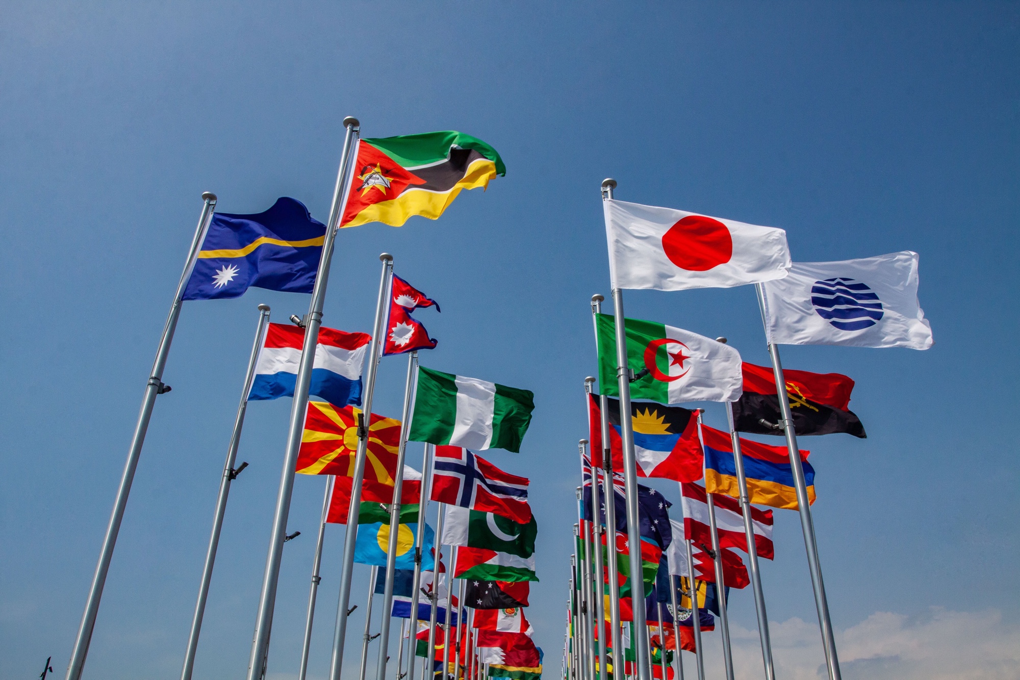 Drapeaux des nations à l’entrée Ouest de l’Expo Osaka 2025.