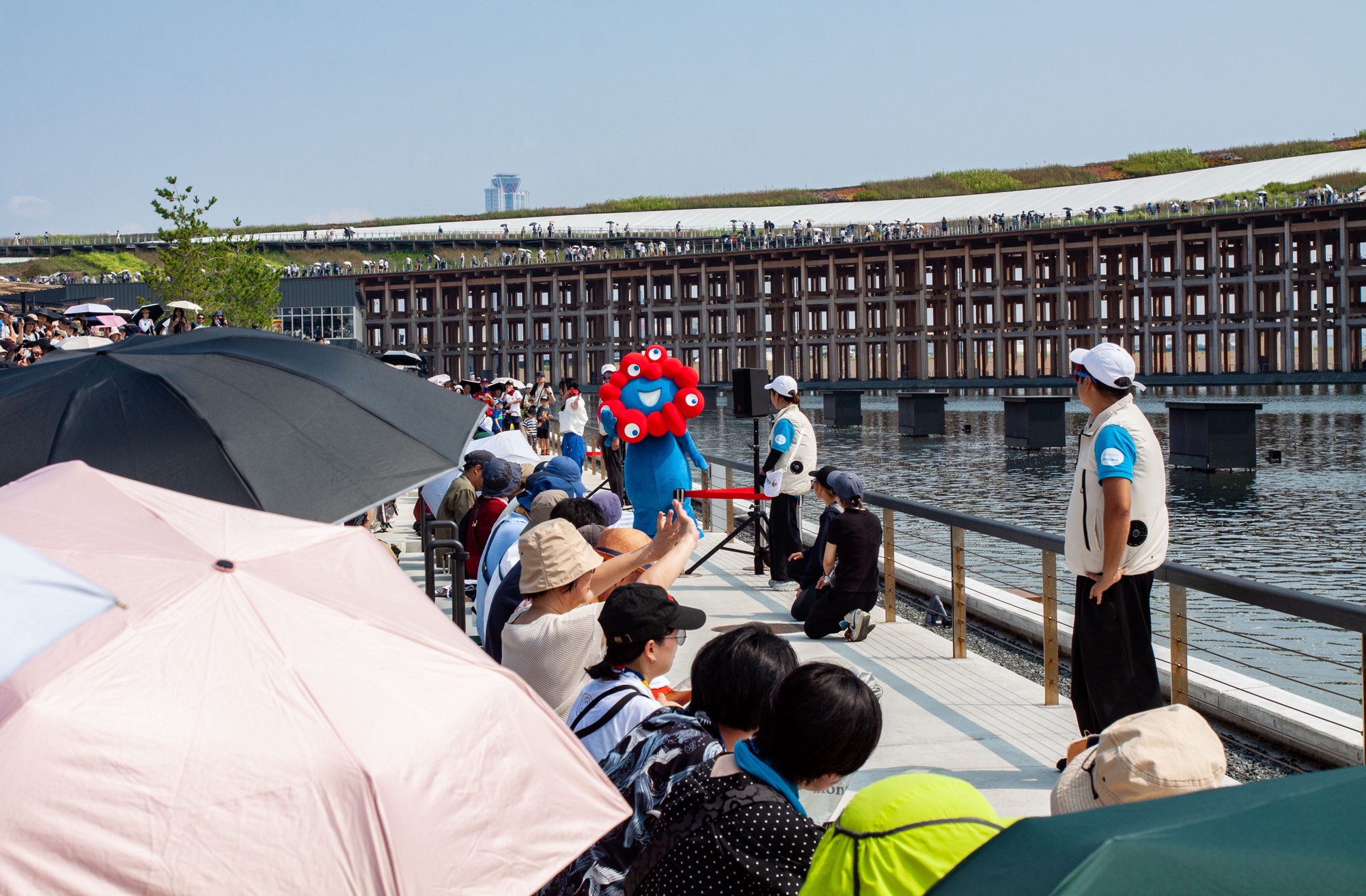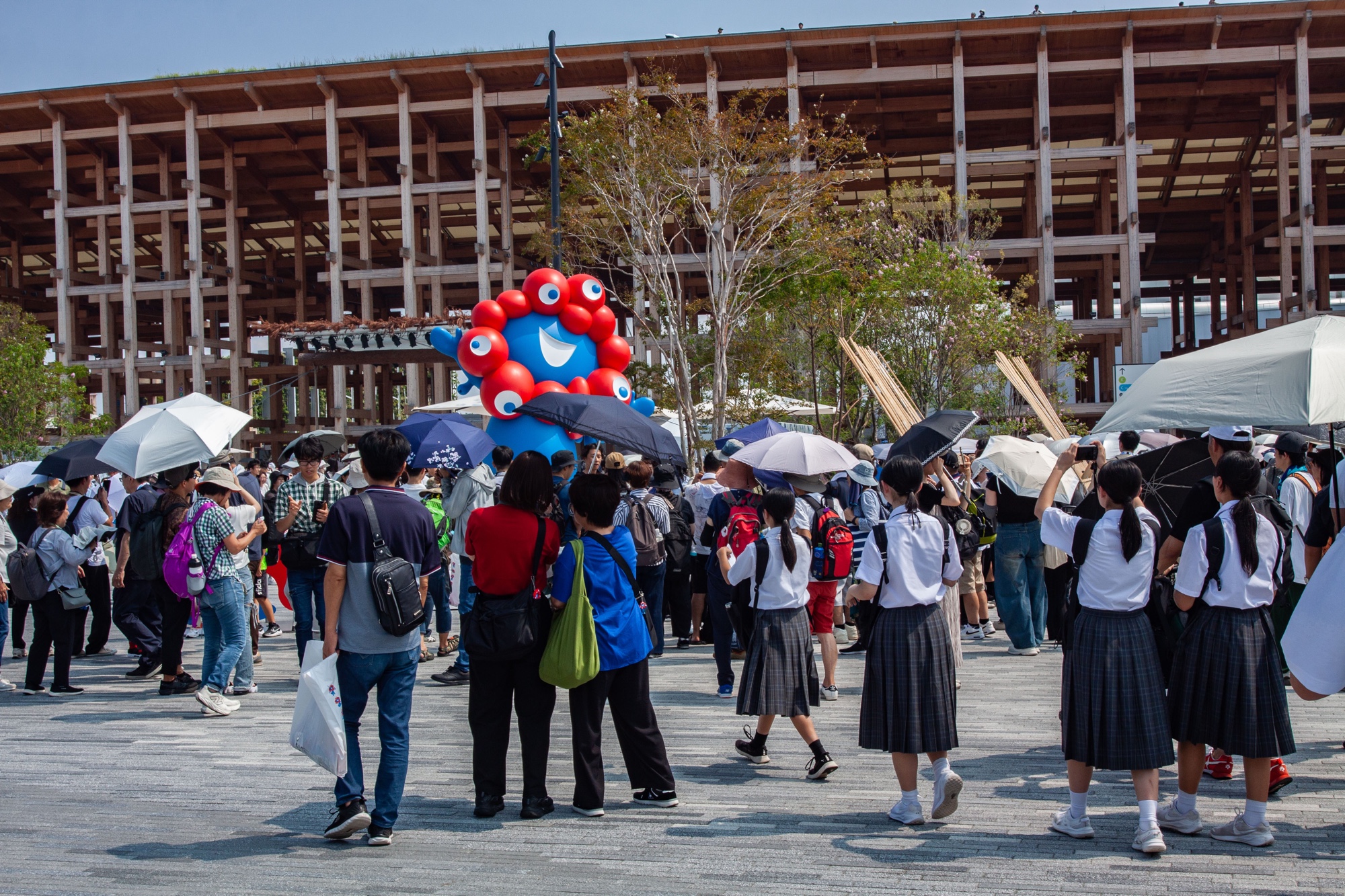 Nous voilà enfin devant le grand anneau de bois conçu par Sou Fujimoto. J’avais pu en voir des photographies et une reconstitution très partielle d’une toute petite portion lors de l’exposition dédiée à l’architecte au Mori Art Museum de Roppongi Hills. La version réelle devant nous est impressionnante, même de loin. La politesse nous impose de saluer la statue de l’étrange mascotte bleue et rouge Myaku-Myaku (ミャクミャク). Ce personnage mignon avait étonné la population lors des premières présentations, mais il est désormais très populaire. Nous l’adorons aussi, pour être très honnêtes. Il détrônerait presque Hikonyan (ひこにゃん), la mascotte de la ville de Hikone, dans le palmarès très limité des mascottes que nous apprécions. Myaku-Myaku a été créé par l’illustrateur Kouhei Yamashita, connu sous le pseudonyme mountain mountain. Son design a été sélectionné parmi près de 1 900 propositions lors d’un concours national organisé en 2022. Le nom a, lui aussi, fait l’objet d’un concours. Cet étrange personnage un peu cosmique représente une créature mystérieuse née de la fusion de cellules et d’eau, symbolisant la vie et la transformation. Myaku (ミャク) fait référence à la circulation du sang, et sa répétition donne une impression de continuité infinie, d’énergie et de vie qui se transmet. Myaku-Myaku est en quelque sorte une métaphore vivante de la transmission de la vie, du futur et de la continuité entre les générations. Le personnage est tellement populaire qu’on trouve toutes sortes d’objets et de peluches à son effigie.