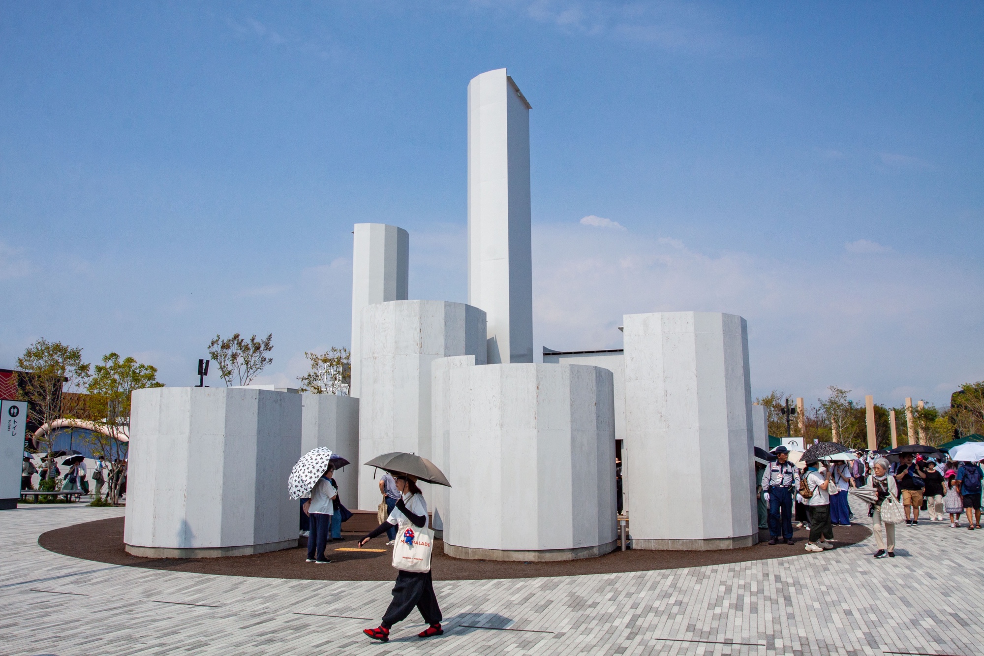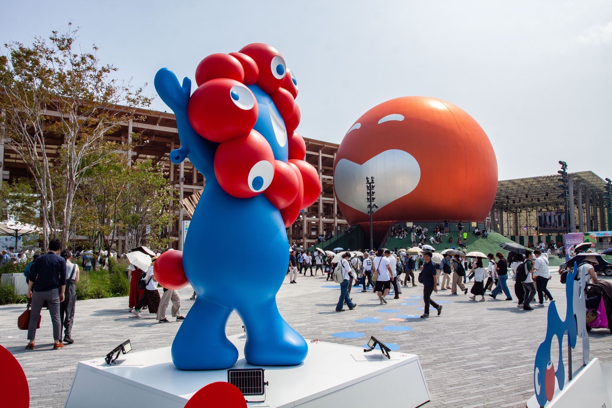Myaku-Myaku, mascotte de L’Expo à l’entrée Ouest, devant l’emblématique anneau « Grand Ring » conçu par Sou Fujimoto.