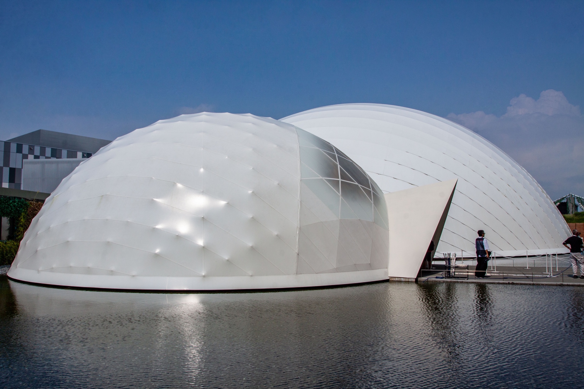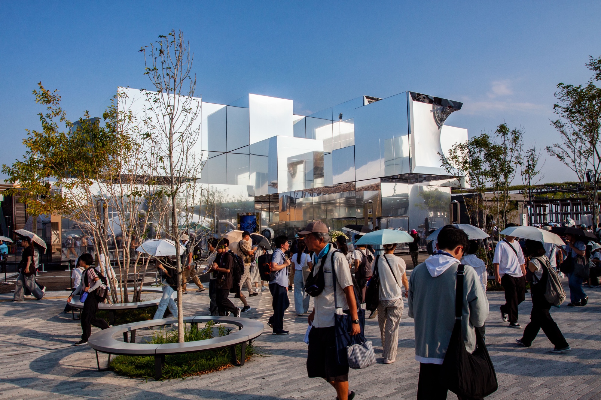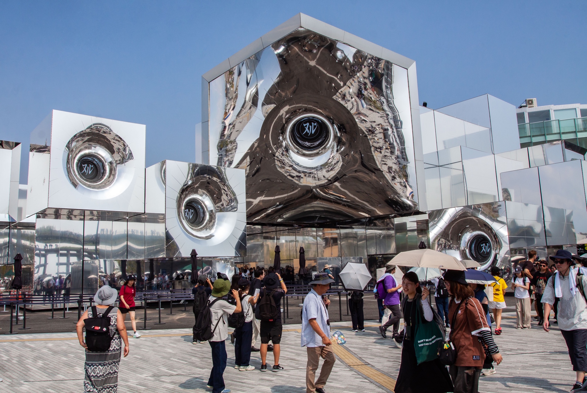 Je traverse d’abord la partie Nord de l’expo pour descendre ensuite vers la partie Sud où se trouve la zone Signature. On y trouve entre autres le Earth Mart conçu par Kengo Kuma et un très étrange pavillon argenté nommé Null² (prononcé nurunuru, ヌルヌル), conçu par NOIZ Architects et produit par l’artiste Yoichi Ochiai. Cet objet architectural futuriste et mystérieux se compose de blocs couverts de membranes-miroirs faites d’un composite résine-métal avec une finition très réfléchissante. Ces membranes vibrent avec le son, ce qui provoque des distorsions de l’environnement réfléchi autour du pavillon. Je n’ai malheureusement pas vu l’intérieur, accessible seulement sur réservation, mais on y trouve une salle d’exposition où les visiteurs peuvent utiliser une application pour créer leur avatar numérique. Celui-ci imite les gestes des visiteurs et interagit dans un espace virtuel. Ce pavillon entend interroger ce que signifiera la vie dans le futur, notamment à l’interface entre le physique et le numérique.