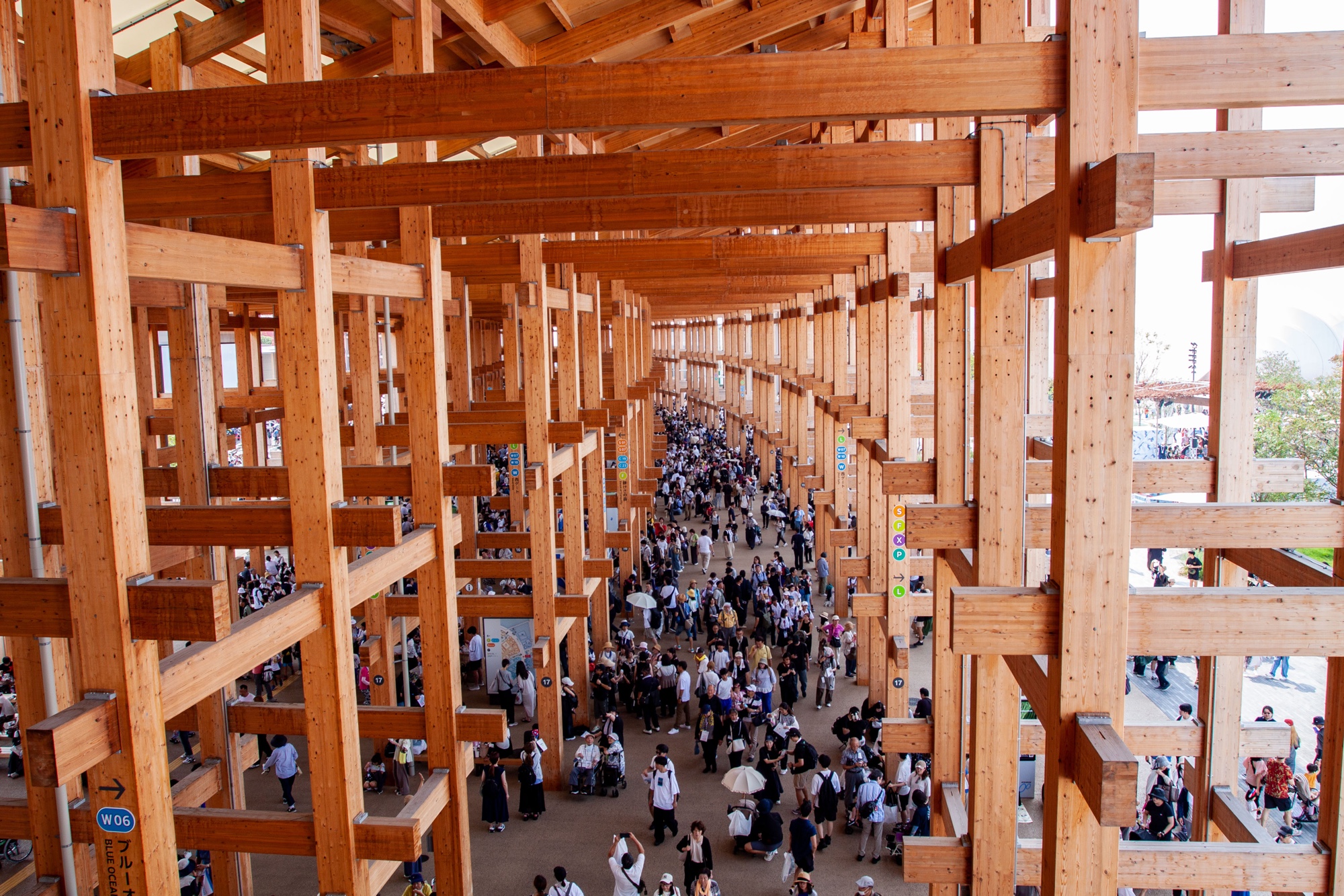 La partie sud de l’Anneau rassemble une série de pavillons thématiques, souvent dotés de l’architecture la plus emblématique. Cette zone, appelée Signature, donne sur la Water Plaza, un espace ouvert sur l’océan et encadré par la partie sud du grand Anneau. Le centre de l’Anneau est vide. On y trouve un grand espace vert appelé la forêt de la tranquillité. Comme son nom l’indique, il s’agit d’un espace boisé sans pavillons, mais avec quelques installations artistiques disséminées çà et là. Outre les pavillons, il y a beaucoup de choses à observer dans l’enceinte de l’Expo. Les toilettes et les espaces de repos sont tous stylisés par des concepteurs différents. Heureusement d’ailleurs, car les pavillons restent difficilement accessibles à moins de vouloir perdre beaucoup de temps dans les files d’attente. On disait qu’il fallait attendre jusqu’à quatre heures pour certains pavillons, comme le français ou l’américain. Attendre environ une heure semble être la norme pour de nombreux pavillons nationaux, tandis que le pavillon japonais et ceux de la zone Signature n’étaient accessibles que sur réservation préalable. Les pavillons Commons sont en principe plus accessibles, mais des files d’attente s’y formaient également. Il n’était pas rare de voir certains pavillons fermer temporairement aux nouvelles entrées lorsqu’ils avaient atteint leur capacité d’accueil.