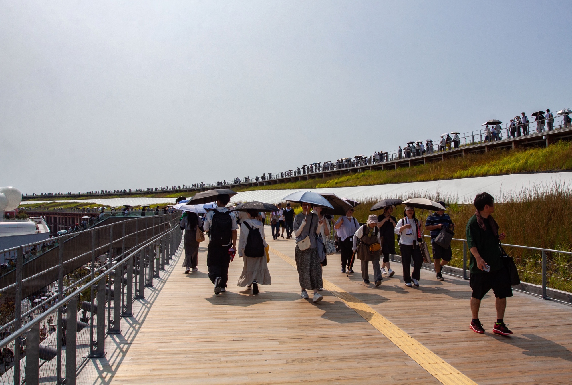 On nous avait prévenus qu’il y aurait foule à l’Expo, et c’est le moins qu’on puisse dire. Elle fermera ses portes le 13 Octobre 2025, et tout ou presque disparaîtra ou sera délocalisé. Les chaleurs de l’été ayant été infernales cette année, nombreux sont ceux, comme nous, à avoir préféré venir en Septembre. Il fait tout de même chaud, environ 31 degrés, mais le ciel nuageux nous a en partie épargné. Les pavillons installés à l’intérieur de l’anneau, ou à sa périphérie immédiate, sont nombreux. Certains demandaient des réservations préalables, tandis que les autres étaient libres d’accès, à condition d’accepter parfois plusieurs heures d’attente. Deux semaines avant notre départ, nous avons tenté la loterie pour réserver des places dans quelques pavillons, mais sans succès. J’avais personnellement dans l’idée de découvrir d’abord les façades de la majorité des pavillons. L’architecture des pavillons, qu’ils soient nationaux ou spécialisés, est tout à fait remarquable et vaut le déplacement malgré la foule et la chaleur. J’ai bien entendu commencé par gravir les escaliers du grand anneau de bois de Sou Fujimoto. Ce Grand Ring mesure 2025 mètres de circonférence, un clin d’œil direct à l’année de cette exposition. On peut en faire le tour complet, mais je n’ai pas tenté le coup, ce que je regrette un peu maintenant. On y accède par plusieurs escaliers et escalators, ce qui est vivement conseillé pour avoir une vue d’ensemble de l’enceinte de l’exposition.