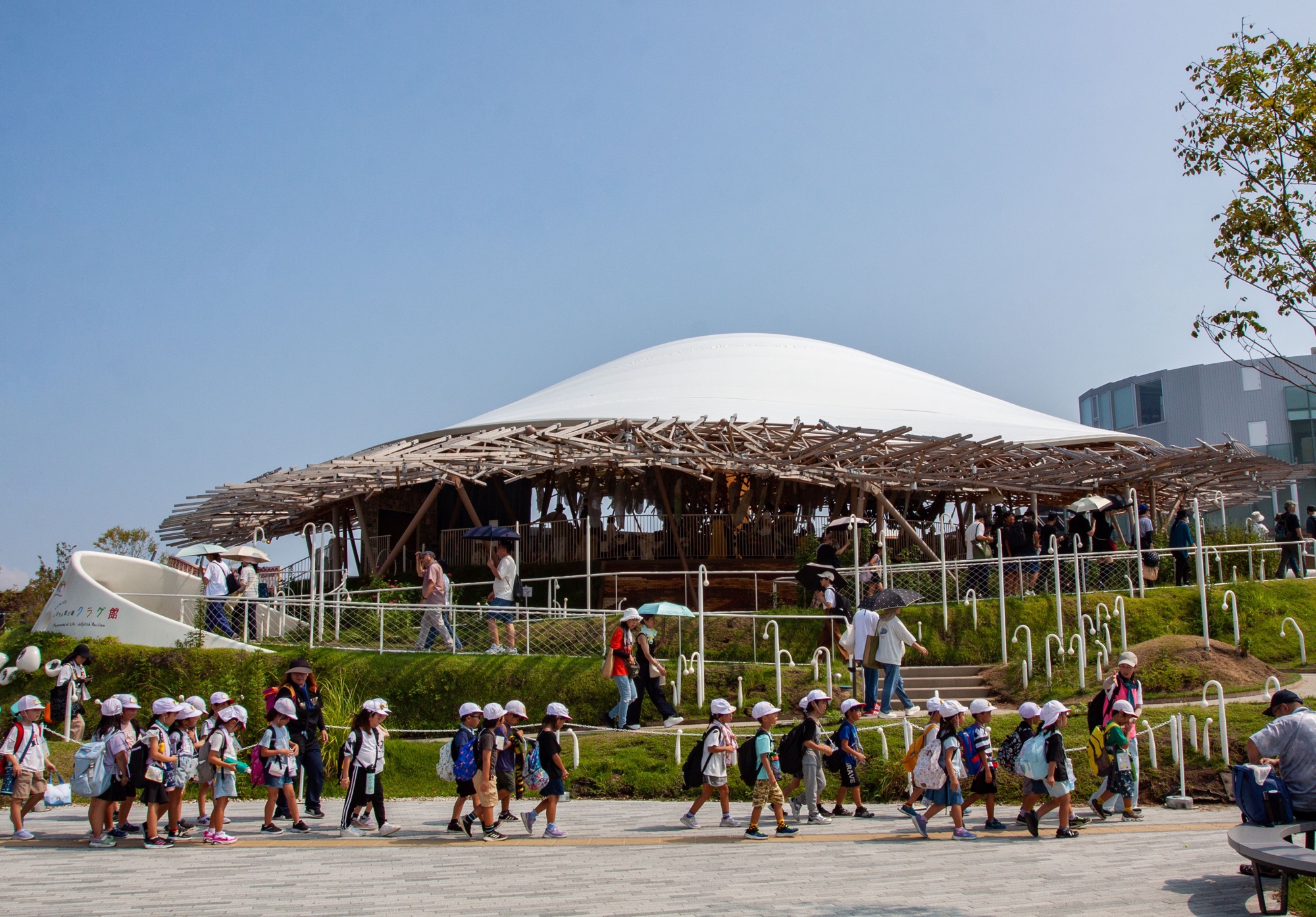Devant le Jellyfish Pavillon (くらげ館), je suis surpris de voir un groupe scolaire attendre sagement devant l’entrée. Je m’en suis rendu compte plus tard en regardant mes propres photographies, mais il y avait beaucoup d’écoliers ce jour-là. Il s’agissait certainement, pour certains, de leur voyage scolaire de collège. En redescendant vers l’océan, au sud de l’anneau, un spectacle de jets d’eau commençait tout juste. À la fin de celui-ci, la mascotte Myaku-Myaku apparaissait sur le devant de la scène sous les regards amusés de la foule. La mascotte ne parle pas mais est accompagnée d’une présentatrice qui fait les questions-réponses, interprétant les moindres faits et gestes de Myaku-Myaku. Cette apparition inattendue m’a donné le sourire pendant quelques instants.