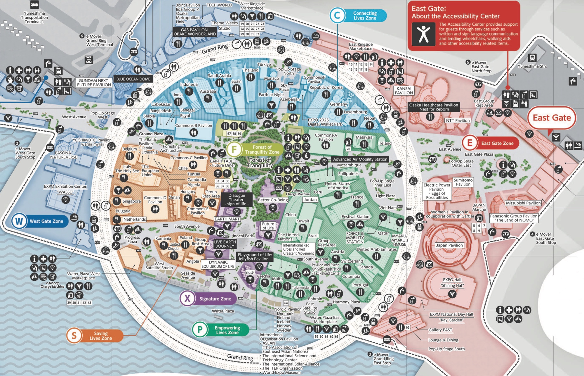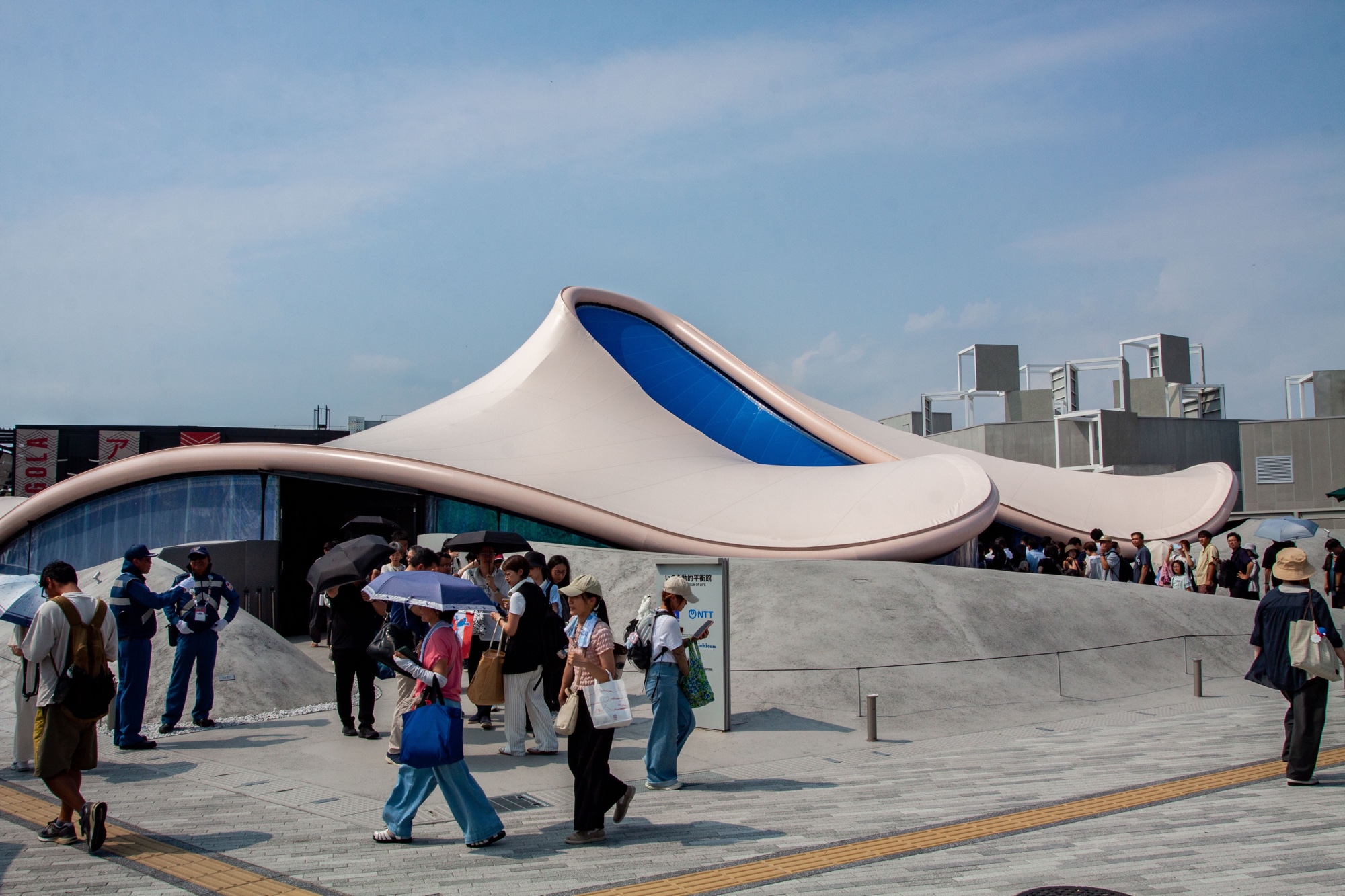 Le vaste espace de l’Expo d’Osaka 2025 se divise en plusieurs zones. Les entrées Est et Ouest contiennent quelques pavillons. Ceux du Japon et des grandes compagnies japonaises comme Mitsubishi, Sumitomo ou NTT se trouvent à l’Est. L’entrée Ouest est plus limitée, mais on y trouve le Blue Ocean Dome, une reconstitution d’un robot Gundam géant, le pavillon Yoshimoto, entre autres.