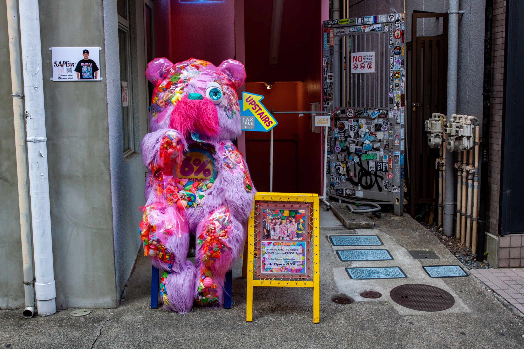 Le monstre coloré de la première photographie est posé devant la boutique 6%DOKIDOKI emblématique d’Harajuku. Elle a été fondée en 1995 par Sebastian Masuda, qui est lui-même une figure centrale du mouvement kawaii, ayant grandement contribué à définir l’identité visuelle de Kyary Pamyu Pamyu, notamment pour les décors de ses vidéos. La notoriété de la boutique s’est entre autres propagée par ses vendeuses au look excentrique très coloré jouant également les modèles, comme par exemple Yuka Mizuhara, la sœur de l’actrice et modèle Kiko Mizuhara. Elles ont également beaucoup contribué à la notoriété visuelle du magasin en apparaissant dans les magazines comme FRUiTS, que j’ai deja mentionné sur ces pages.