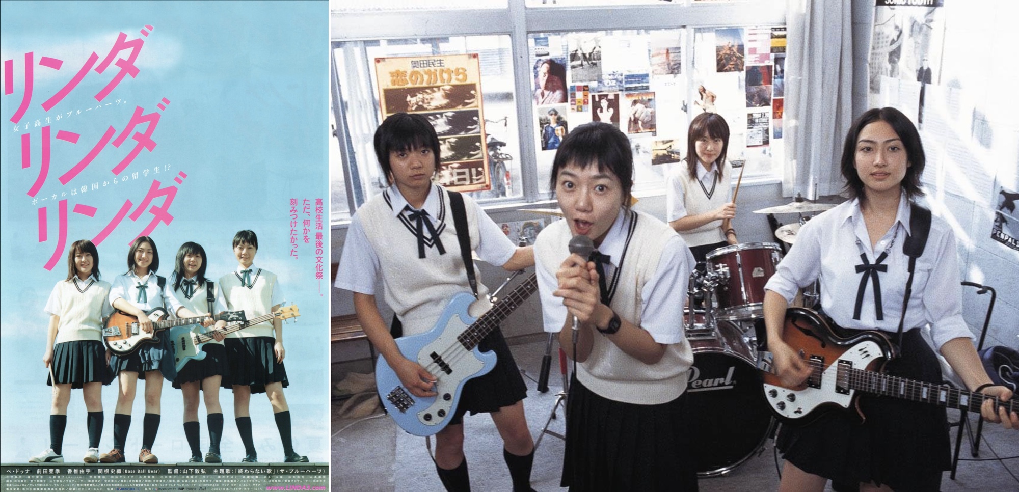 Je pensais avoir déjà vu le film Linda Linda Linda (リンダ リンダ リンダ) réalisé par Nobuhiro Yamashita (山下敦弘) en 2005, mais le regarder récemment m’a confirmé que non. Il faisait partie des films japonais évoquant l’âge de la jeunesse (青春) et la musique rock que je voulais voir depuis longtemps. L’histoire se déroule dans un lycée japonais de la banlieue d’Hachiōji, à l’approche du festival scolaire appelé Bunkasai (文化祭). Un groupe de lycéennes avait prévu de jouer ses propres compositions pour ce festival, mais des tensions internes ont fait capoter leur projet à la dernière minute. Les trois filles restantes de la formation originale ne perdent pas espoir et décident de reformer un groupe en recrutant une étudiante coréenne nouvellement arrivée, nommée Son, pour être la chanteuse, même si son japonais est encore hésitant. Après quelques tergiversations, elles choisissent de reprendre des morceaux du groupe punk The Blue Hearts (ブルーハーツ), dont l’emblématique morceau Linda Linda (リンダ リンダ) qui donne son nom au film. Le film suit leurs répétitions, leurs maladresses et leur amitié qui se construit jusqu’au concert final. Outre le morceau Linda Linda, le groupe de lycéennes reprend également les morceaux Boku no Migi Te (僕の右手) et Owaranai Uta (終わらない歌) des Blue Hearts. Le groupe prend le nom Paran Maum (파란 마음), qui est une traduction en Coréen de Blue Hearts, et se compose de Son, jouée par Bae Doona (배두나), l’étudiante coréenne chanteuse du groupe, Kei Tachibana interprétée par Yū Kashii (香椎由宇), la guitariste, Nozomi Shirakawa, jouée par Shiori Sekine (関根史織), la bassiste et Kyoko Yamada, jouée par Aki Maeda (前田亜季), la batteuse du groupe. Un fait intéressant à noter est que Shiori Sekine est réellement musicienne, étant bassiste du groupe Base Ball Bear. Un fait plus intéressant est que Shiori Sekine a joué avec Sheena Ringo dans la formation spéciale Elopers pour l’émission Music Station du 15 Octobre 2021 (je l’évoquais dans un billet) aux côtés d’AiNA the End, Yuu du groupe Chirinuruwowaka (チリヌルヲワカ) et Hona Ikoka du groupe Gesu no Kiwami Otome (ゲスの極み乙女). Avec Ringo à la guitare, AiNA chantait Gunjō Biyori (群青日和), un des titres emblématiques de Tokyo Jihen. Un fait encore plus intéressant est que Sheena Ringo est évoqué dans le film Linda Linda Linda. Alors que le groupe cherche des artistes ou groupes pour en faire des reprises pour le festival du lycée, la batteuse Kyoko mentionne Sheena Ringo, mais la guitariste Kei lui répond immédiatement que ça sera trop difficile à apprendre en trois jours et elles mettent rapidement cette idée de côté pour finalement se tourner vers le punk rock des Blue Hearts. Nozomi, interprétée par Shiori Sekine, qui regarde cette scène dans le film ne sait pas encore qu’elle jouera avec Sheena Ringo 16 ans plus tard. Un autre fait tout à fait intéressant est que la bande originale du film, outre les trois morceaux des Blue Hearts, a été composée par James Iha des Smashing Pumpkins. Les morceaux instrumentaux qu’il a composé accompagnent les scènes de répétition, les errances des quatre filles dans le lycée et les moments plus intimistes. James Iha, de son nom complet James Yoshinobu Iha (イハ・ヨシノブ), est américain d’origine japonaise (qu’on appelle Nisei, c’est à dire de deuxième génération), né de parents immigrés japonais installés aux États-Unis. Le film a en fait une deuxième bande originale intitulée We Are Paranmaum, qui comprend les trois chansons complètes des Blue Hearts mentionnées ci-dessus, enregistrées par les actrices du film, mais également trois inédits dont l’excellent Aoi Kokoro (蒼い心). J’écoute donc ce EP de six titres et j’ai fini par apprécier la légère maladresse du chant de Bae Doona, qui n’est pas vraiment problématique quand il s’agit de punk rock. Je n’ai jamais vraiment été attiré par la musique des Blue Hearts mais j’écoute ensuite leur album éponyme de 1987. Même sans être amateur des morceaux du groupe, il est difficile au Japon d’échapper au morceau Linda Linda (リンダリンダ), notamment au karaoke, car il y a toujours quelqu’un qui choisira ce morceau plutôt facile à chanter en groupe. Le film Linda Linda Linda a le statut de film culte. On y trouve un naturel certain qui a dû rappeler à beaucoup de japonais leurs propres festivals Bunkasai de leurs lycées. Personnellement, je ne connais ces festivals que de loin à travers ceux de l’école de mon fils qui est justement lycéen. J’imagine très bien qu’ils ont un effet de rite de passage, et c’est toute l’idée montrée par le film. On sent que les quatre lycéennes sortiront changées de cette expérience éprouvante mais gratifiante de répétition et de représentation devant un public réceptif à leur musique certes maladroite mais extrêmement sincère.